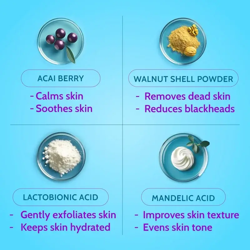 Imagine a scrub that effectively tackles dead skin and blackheads without being harsh on your skin. Our unique formula combines physical exfoliants like Walnut Shell Powder with gentle chemical exfoliants such as Lactobionic and Mandelic Acids. This dual-action approach ensures deep yet gentle exfoliation. Enriched with Acai Berry and Shea Butter, it also brightens your skin and locks in essential moisture, leaving it soft and supple. For those in Sri Lanka seeking effective exfoliation, this is a must-have, easily found through online shopping.