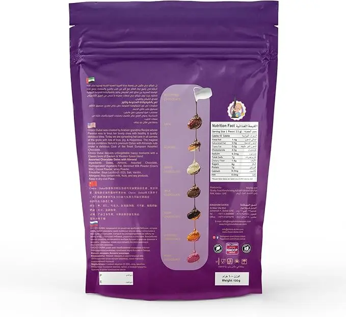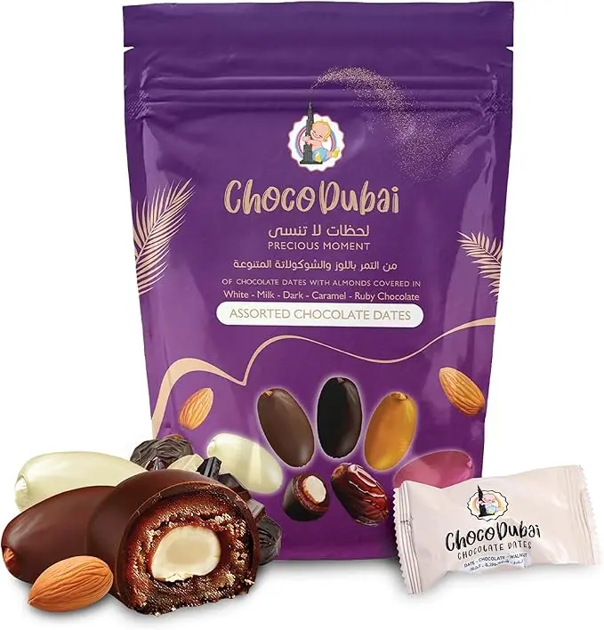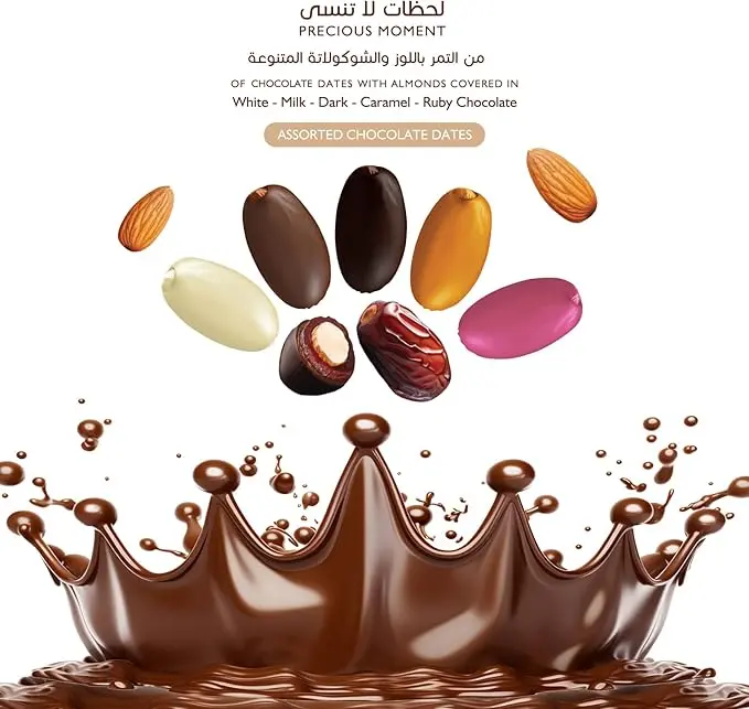 Discover a truly exquisite treat with Choco Dubai Assorted Chocolate Coated Dates with Almond. These gourmet Arabic sweets combine the natural sweetness of dates with the satisfying crunch of roasted almonds, all generously coated in a delightful mix of milk, dark, white, and new ruby chocolates. It’s a luxurious taste experience unlike any other.