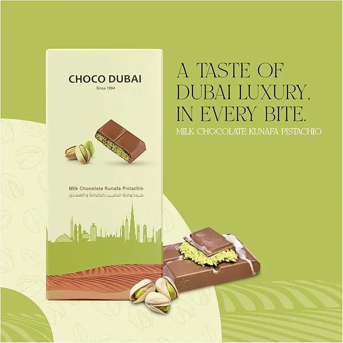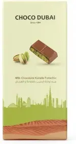 Experience a delightful fusion of flavors with the Choco Dubai Milk Chocolate Bar, featuring crispy Kunafa and Pistachio cream. This 100g bar offers a rich and indulgent taste, combining the smoothness of milk chocolate with the satisfying crunch of kunafa and the nutty creaminess of pistachio. It’s a treat that awakens your senses.