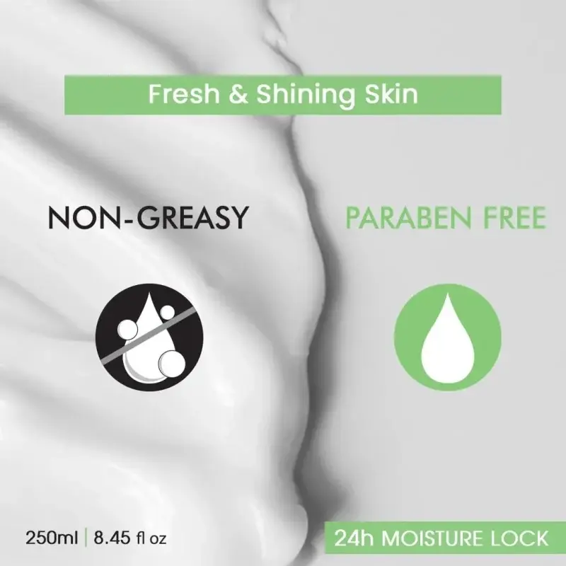 This hydrating formula is packed with the goodness of Aloe Vera and Milk, known for their moisturizing and skin-revitalizing properties. The lotion boasts a lightweight, non-greasy texture that absorbs quickly, leaving your skin feeling soft and smooth without any oily residue. It’s designed to make your skin look and feel its absolute best.