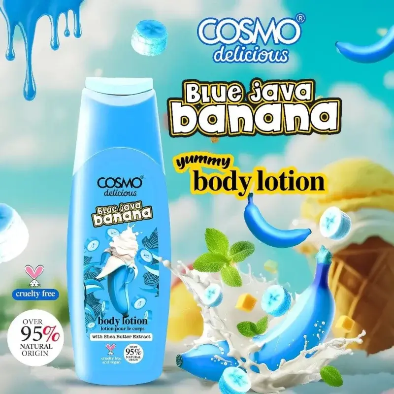 Craving skin that feels incredibly soft, smooth, and smells wonderfully sweet? Indulge your senses and your skin with Cosmo Delicious Blue Java Banana With Shea Butter Pure Hydration Body Lotion. This unique lotion offers a delightful dessert-inspired sweet banana fragrance that lingers, while its creamy texture deeply nourishes and softens dry skin. Say goodbye to rough patches and hello to silky-smooth comfort.