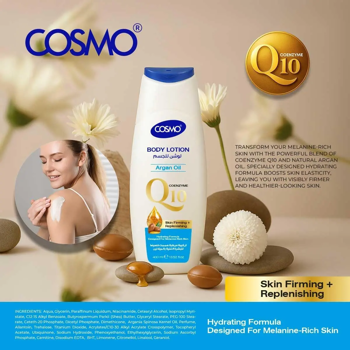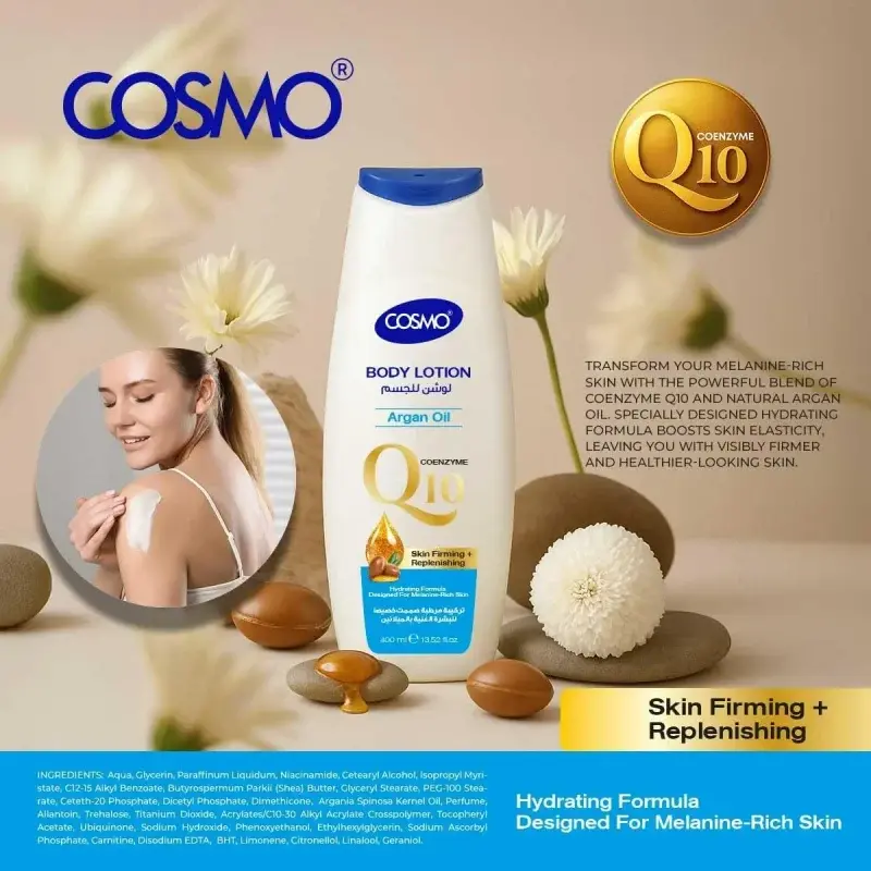 Is your skin feeling less firm and in need of deep nourishment? Revitalize your skin with Cosmo Skin Care Coenzyme Q10 Argan Oil Body Lotion. This unique formula is designed to help improve skin firmness and elasticity, giving you a smoother, tighter look and feel. Infused with the richness of Argan Oil, it deeply moisturizes and restores your skin’s natural radiance, transforming dry or dehydrated skin into a soft, supple, and healthy-looking canvas.