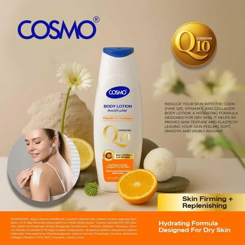 Tired of dull skin that shows signs of aging and dryness? Reveal a brighter, firmer, and more youthful-looking complexion with Cosmo Skin Care Coenzyme Q10 Vitamin C + Collagen Body Lotion. This advanced formula combines the power of Vitamin C, Collagen, and Coenzyme Q10 to help improve skin elasticity, reduce the appearance of fine lines, and boost natural radiance. Say goodbye to dullness and dryness, and hello to revitalized, smooth skin.