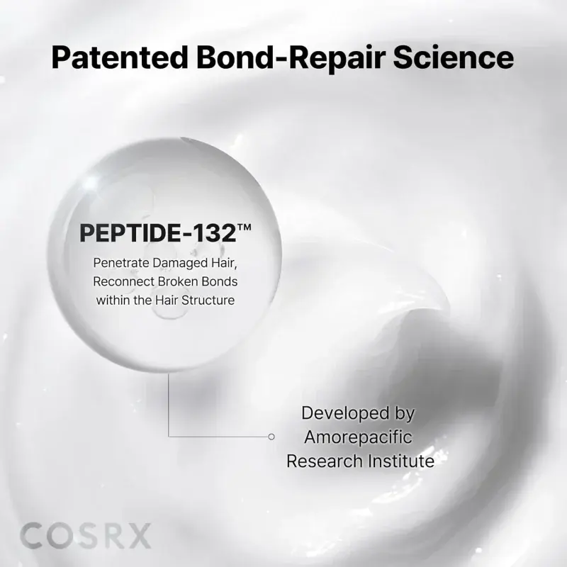 This deep conditioner is powered by the patented PEPTIDE-132, a unique Tripeptide complex that targets damaged keratin. It acts like a puzzle piece, bonding to weak hair structures to intensively repair breakage, minimize split ends, and reinforce each strand from within.