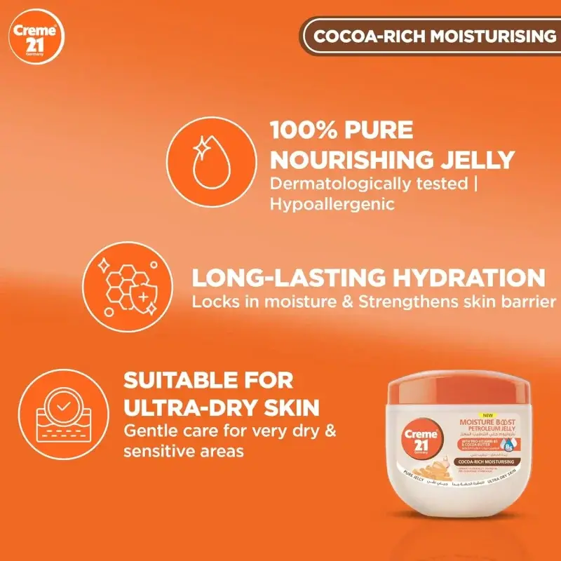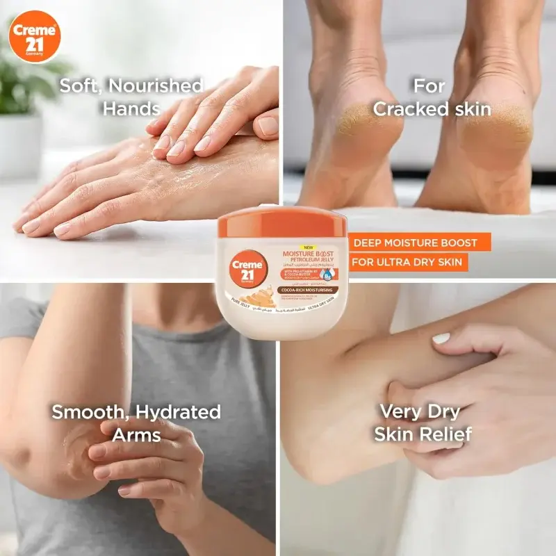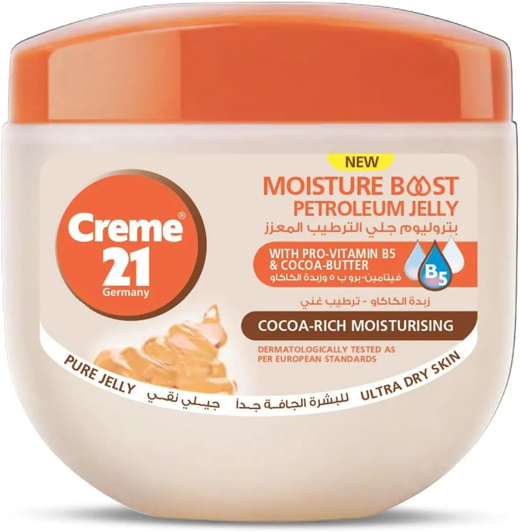 Is your skin feeling rough, dry, and in need of intense nourishment? Creme 21 Cocoa-Rich Petroleum Jelly is here to rescue your skin. This specially formulated jelly combines the deep moisturizing power of cocoa butter with the skin-loving benefits of Pro-Vitamin B5 to provide targeted care for ultra-dry skin.