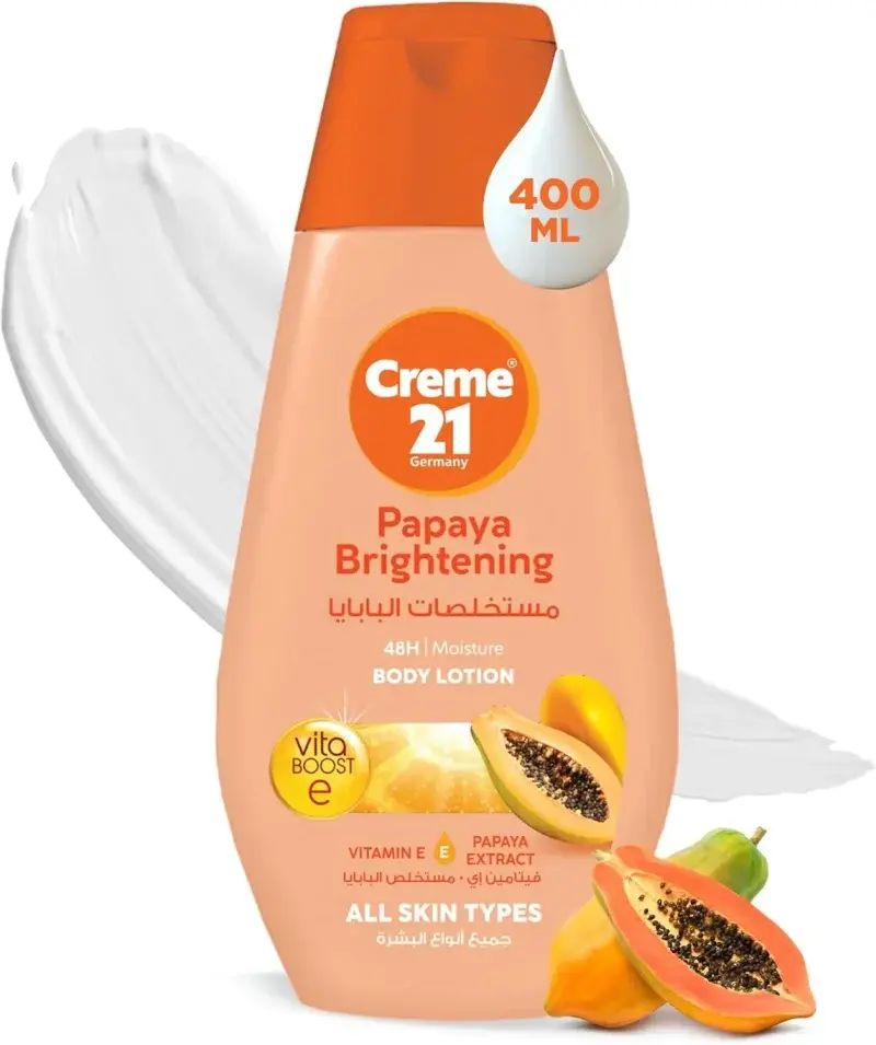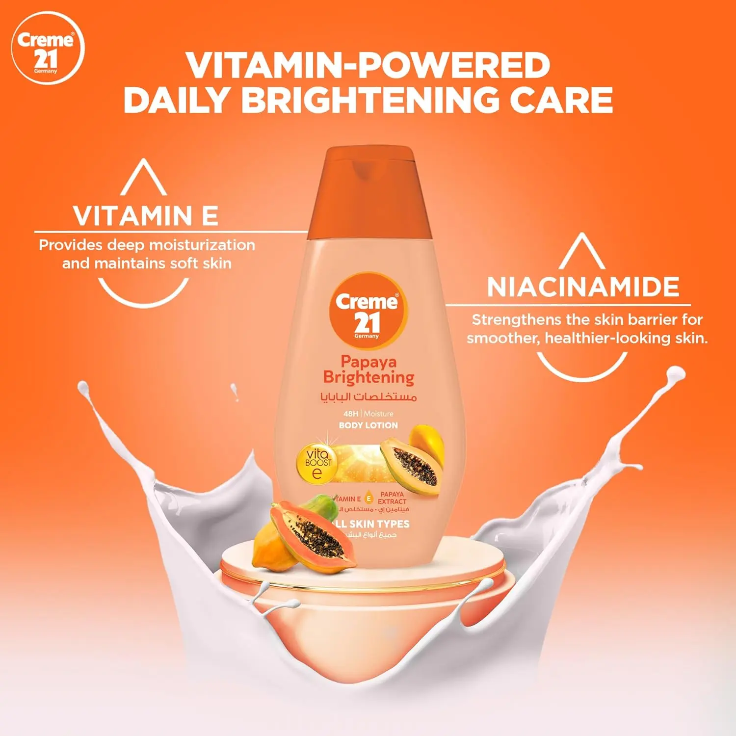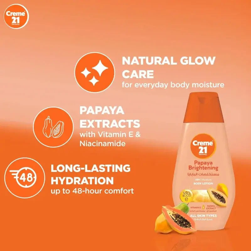 Creme 21 Papaya Brightening Body Lotion is a nourishing and brightening formula created to hydrate, soften and illuminate the skin. Infused with papaya extract and vitamin E, it helps enhance radiance and evenness while maintaining 48-hour moisture. The silky texture provides comfortable daily hydration suitable for all skin types. Perfect for achieving a fresh, healthy glow.