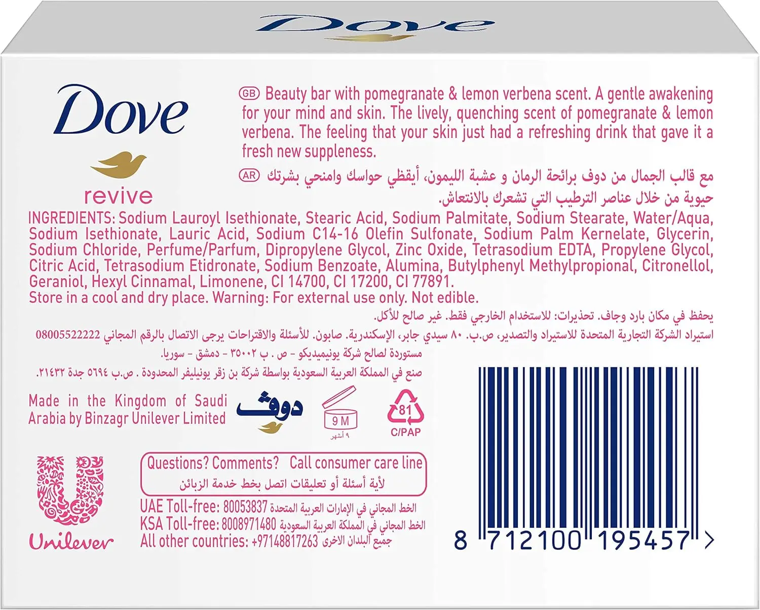 Awaken your senses with the lively scent of pomegranate and lemon verbena. This invigorating fragrance transforms your daily cleansing routine into a refreshing ritual. Combined with Dove’s classic ¼ moisturizing cream, this bar helps your skin retain its natural moisture, making it feel exceptionally soft and smooth after every wash.