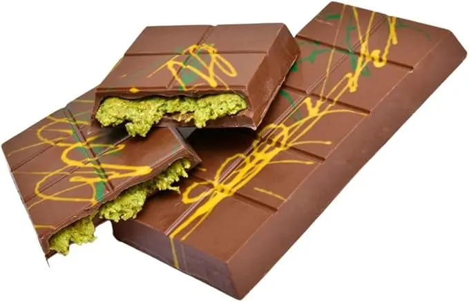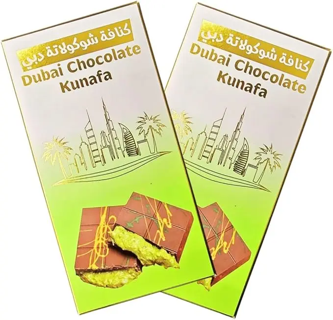 Discover an exquisite fusion of Middle Eastern delight and premium chocolate with this Dubai Chocolate Kunafa Pistachio Bar. Each pack contains two bars, filled with a luscious pistachio cream and featuring authentic, crispy kunafa pieces, all enveloped in rich, smooth chocolate. It’s a gourmet experience that captures the essence of Dubai’s finest confectionery.