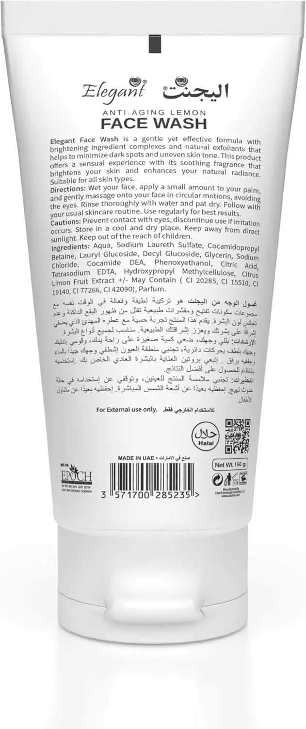 Elegant Anti-Aging Lemon Face Wash is your trusted daily partner for ageless beauty. Made in the UAE and Halal certified, it ensures quality and adherence to your values. Its gentle formulation is suitable for all skin types, including sensitive skin, providing effective cleansing without dryness or irritation.