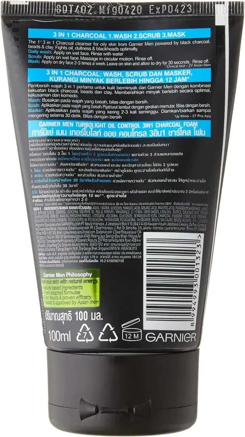Oily skin and blackheads causing you frustration? Garnier Men TurboLight Oil Control Charcoal 3-in-1 Face Wash is your ultimate solution. This unique formula, powered by black charcoal, beads, and clay, fights oil, dullness, and blackheads effectively. Experience the versatility of a single product that cleanses, scrubs, and masks for optimal results.