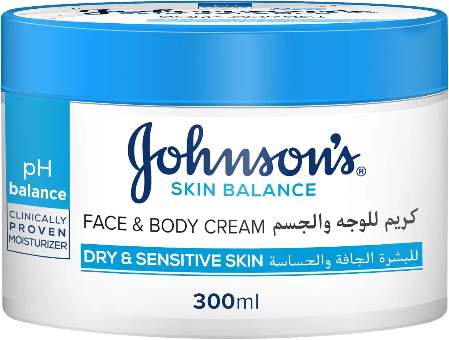 Johnson’s Skin Balance Face and Body Cream is an all-in-one hydrating cream that helps ease signs of dryness leaving your delicate skin supple and smooth., Its unique formula enriched with deeply nourishing ingredients makes it a multi-purpose cream that can be used on any part of the body that could need some extra hydration., Reduce dryness and replenish hydration by using Johnson’s Skin Balance Face and Body Cream and allow it to melt into your skin for long-lasting moisture., This cream’s non-greasy formula allows it to get easily absorbed by the skin for a smoother texture without the oily feel., Include this cream in your skin care regimen to restore pH balance and to boast healthy glowing skin.
