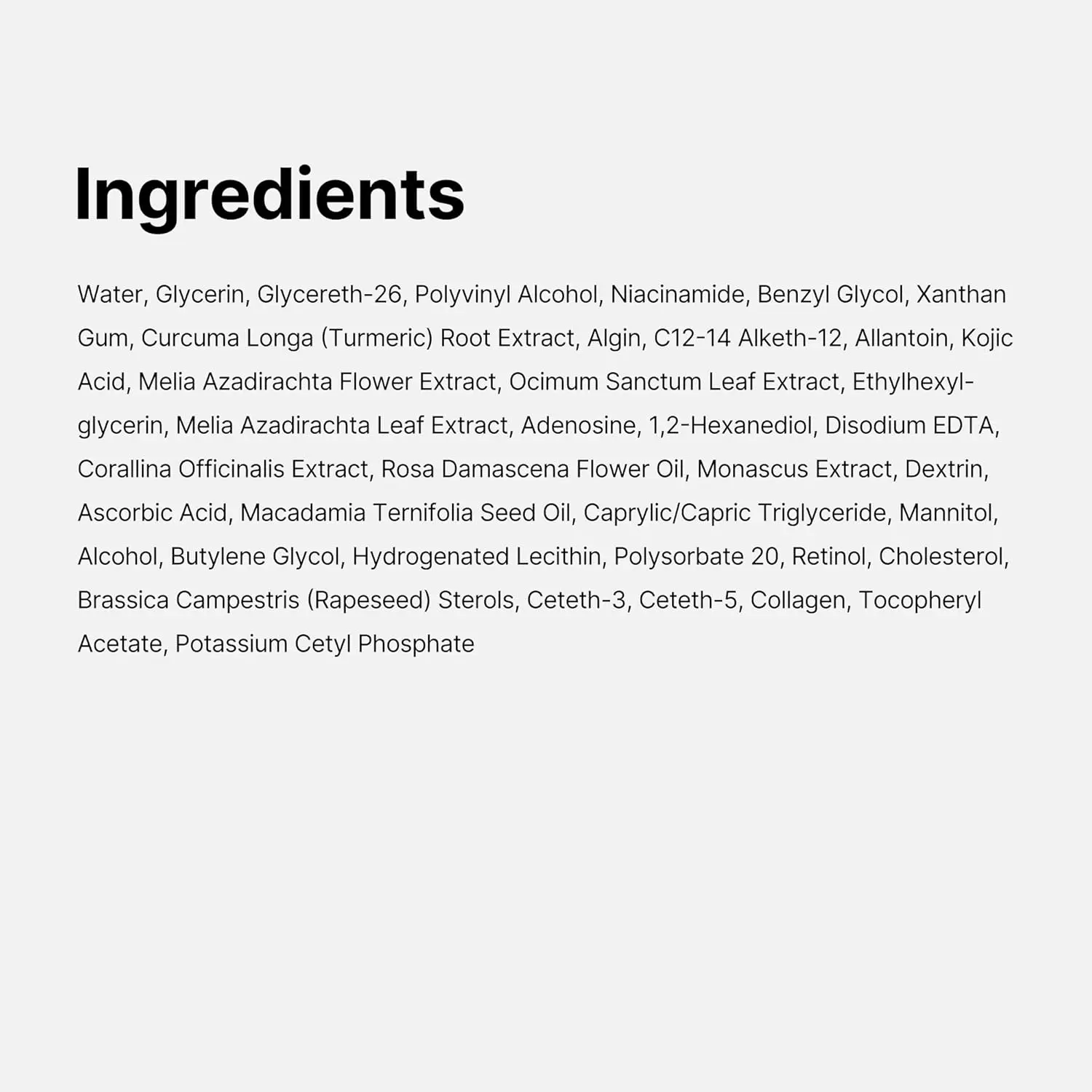 Water, Glycerin, Glycereth-26, Polyvinyl Alcohol, Niacinamide, Benzyl Glycol, Ethylhexylglycerin, Water, Curcuma Longa (Turmeric) Root Extract, 1,2-Hexanediol, Xanthan Gum, Algin, Melia Azadirachta Flower Extract, Ocimum Sanctum Leaf Extract, Melia Azadirachta Leaf Extract, Curcuma Longa (Turmeric) Root Extract, Corallina Officinalis Extract, Water, Allantoin, Kojic Acid, C12-14 Alketh-12, Water, 1,2-Hexanediol, Mannitol, Collagen, Adenosine, Disodium EDTA, Monascus Extract, Dextrin, Rosa Damascena Flower Oil, Ascorbic Acid, Retinol, Hydrogenated Lecithin, Butylene Glycol, Alcohol, Caprylic/Capric Triglyceride, Water, Cholesterol, Glycerin, Disodium EDTA, 1,2-Hexanediol, Polysorbate 20, Macadamia Ternifolia Seed Oil, Brassica Campestris (Rapeseed) Sterols, Ceteth-3, Ceteth-5, Tocopheryl Acetate, Potassium Cetyl Phosphate