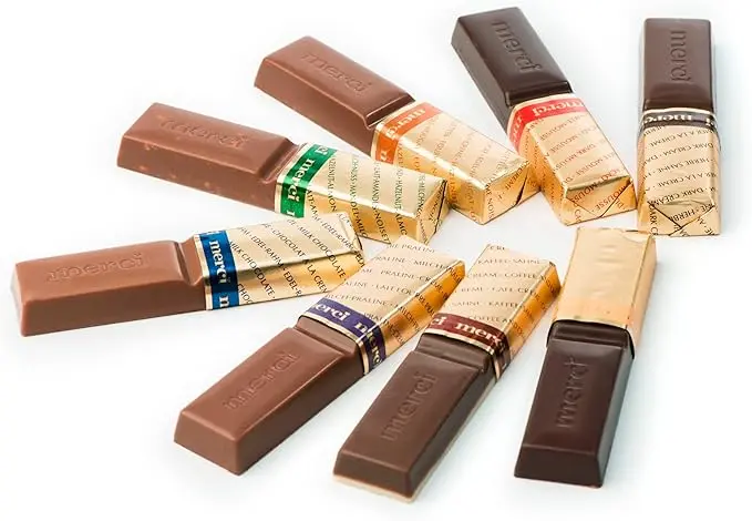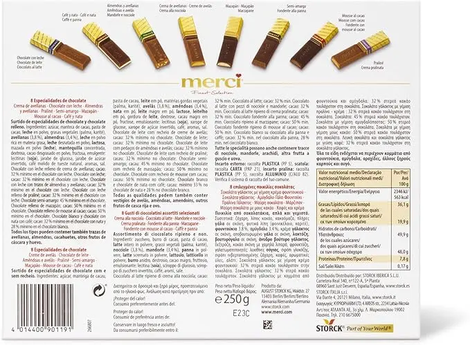 - Milk & Dark Chocolate Box Assortment – This indulgent milk and dark chocolate gift from Merci has 8 of Merci’s exquisite specialities: Hazelnut-Almond, Praline Crème, Milk Chocolate, Hazelnut-Crème, Marzipan, Coffee and Cream, Dark Cream, Dark Mousse