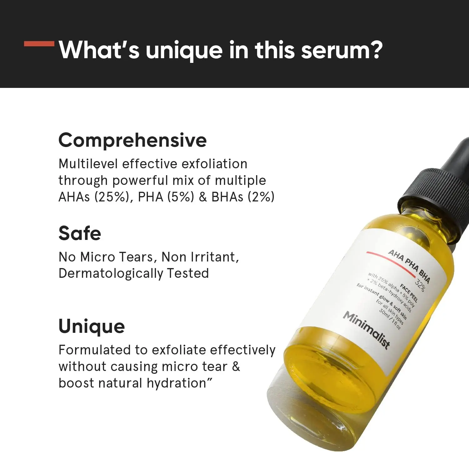 Experience multi-level exfoliation that promotes cell turnover, effectively reducing dullness, age spots, and pigmentation. The combination of AHAs and PHAs provides superficial peeling while BHA deeply cleanses pores and tackles blackheads. Unlike harsh exfoliants, the included PHAs also act as humectants, hydrating and soothing your skin, while Turmeric Extract and Aloe further calm and heal.
