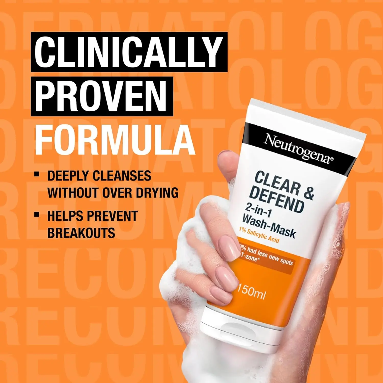 Neutrogena Clear & Defend 1% Salicylic Acid 2-in-1 Wash Mask (1x 150ml) — Wash and Mask for Spot-Prone Skin