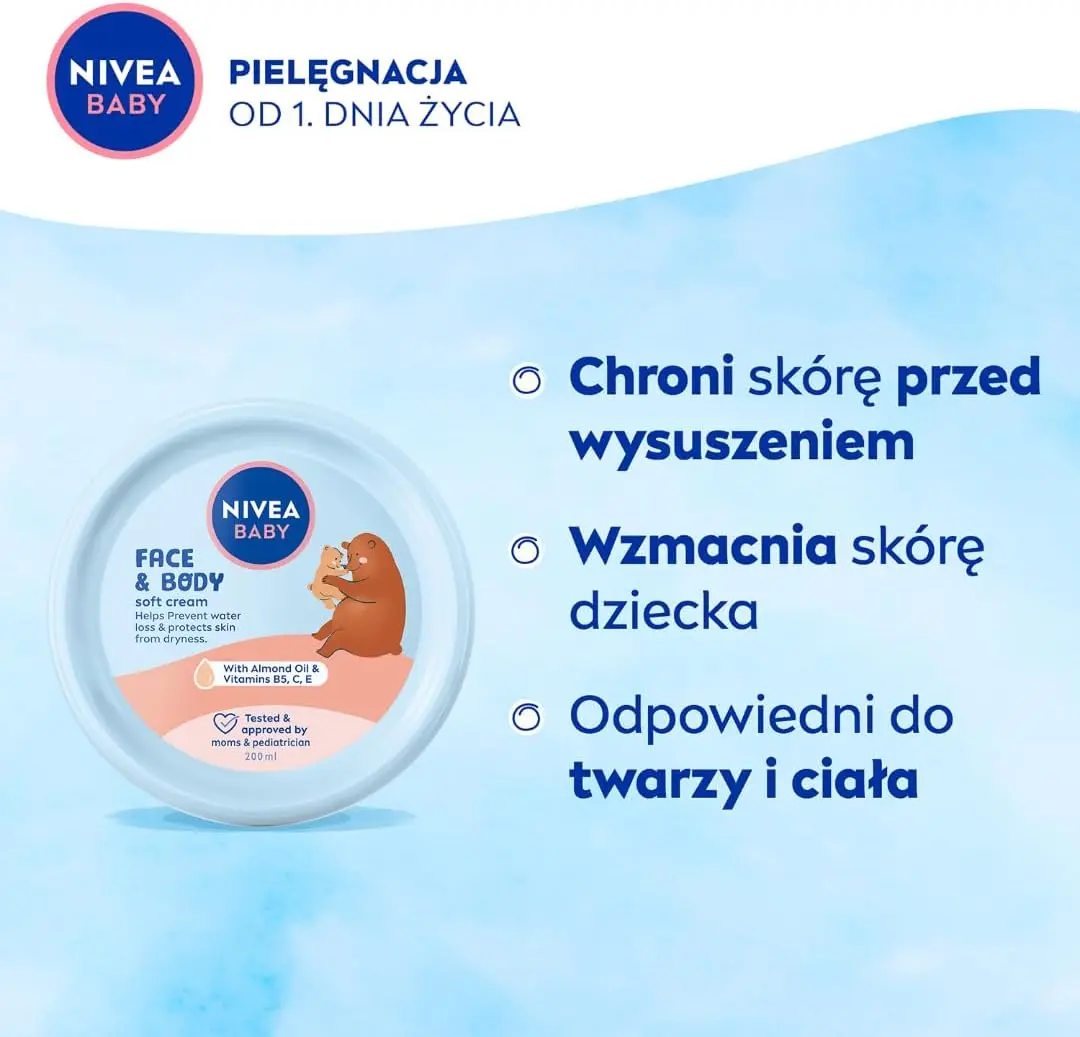 Give your baby’s delicate skin the gentlest care with NIVEA BABY Face and Body Cream. Specially formulated from the first day of life, this cream helps prevent water loss and protects against dryness. Imagine your baby’s skin feeling soft, smooth, and comfortably protected, allowing for healthy development.
