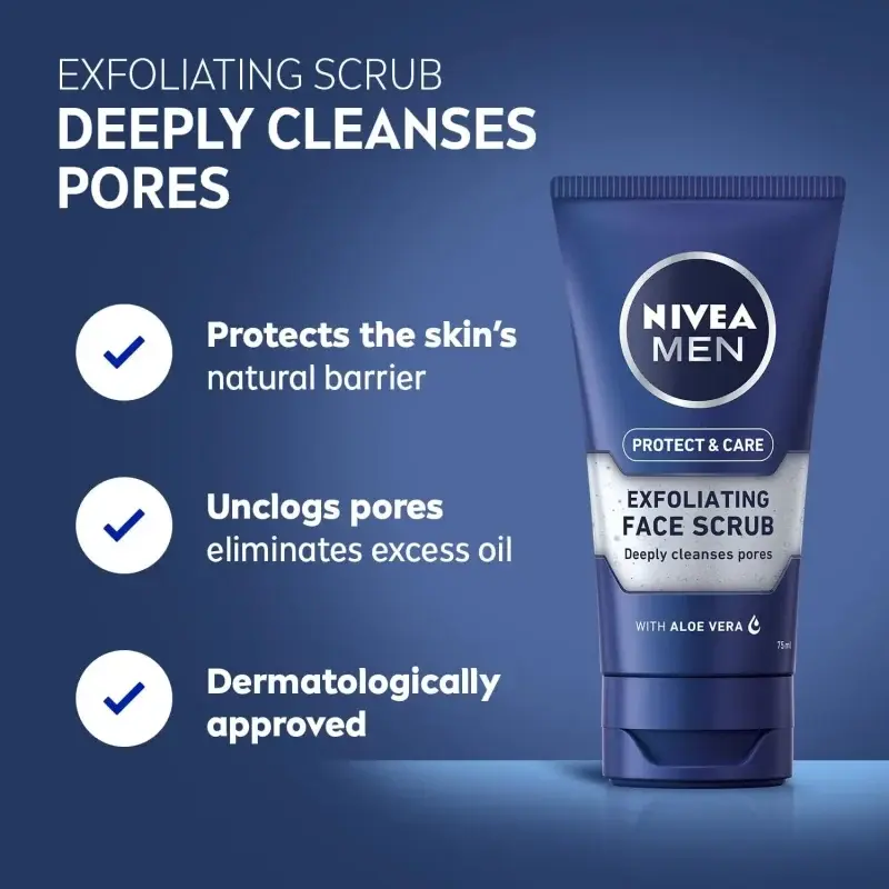 Are you struggling with rough skin texture and clogged pores? NIVEA MEN Protect & Care Exfoliating Face Scrub is here to help. This invigorating 75ml scrub, enriched with Aloe Vera and a masculine fragrance, deeply cleanses your skin, leaving it feeling refreshed and revitalized. Say goodbye to dullness and hello to a smoother, clearer complexion.