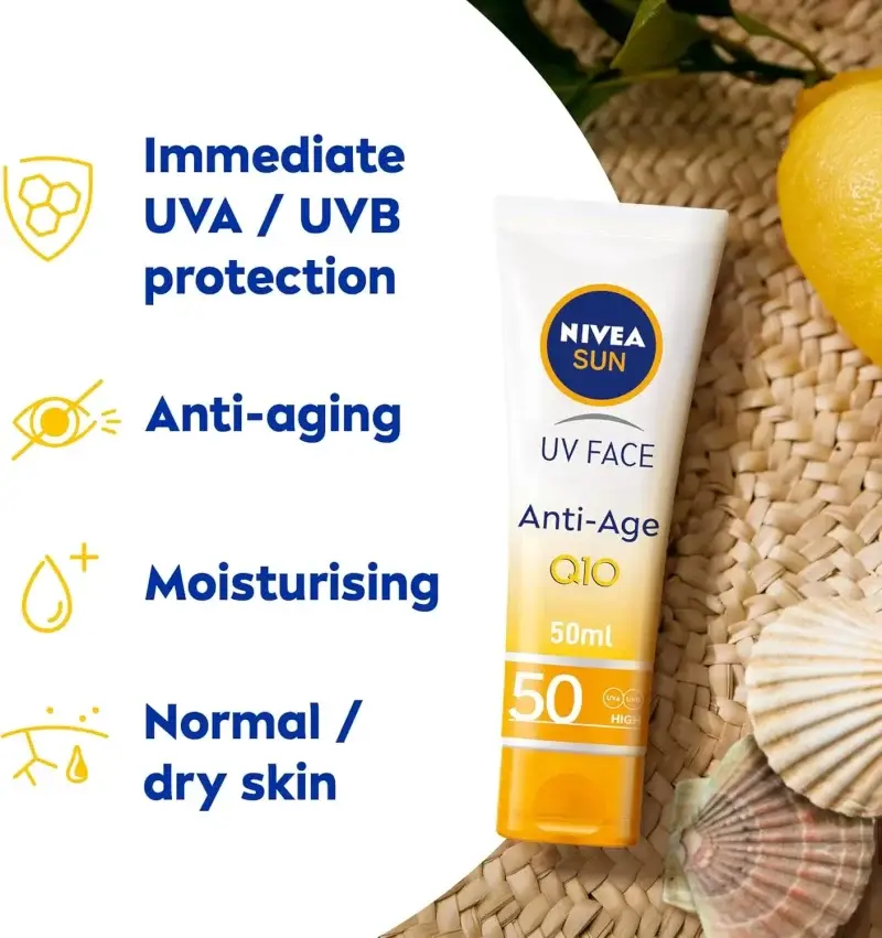 Protect your face from the sun’s harsh rays and the signs of aging with NIVEA SUN Face Cream SPF 50. This advanced formula offers high UVA and UVB protection while combating premature aging with its Q10 technology. Prevent fine lines, wrinkles, and pigment spots, and enjoy skin that looks and feels youthful and protected.
