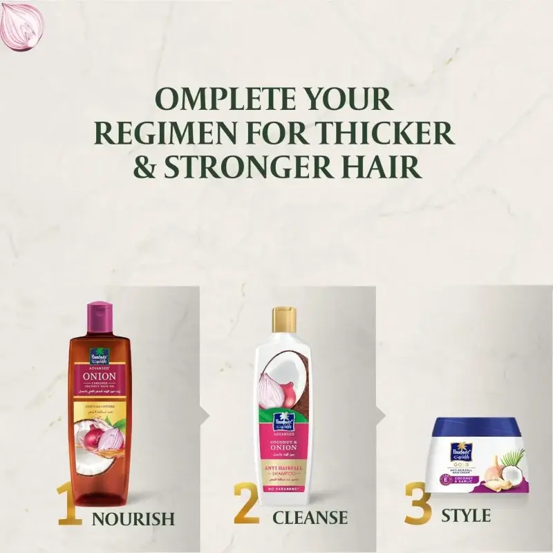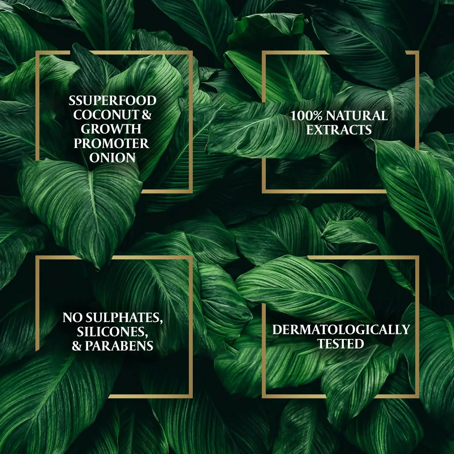 This unique blend combines the power of Onion and Coconut Oil. Onion oil is renowned for its ability to strengthen hair roots and promote growth, while Coconut oil deeply nourishes the scalp and hair shaft. Together, they create a potent formula that reduces hair fall and encourages the growth of thicker, more luscious hair.