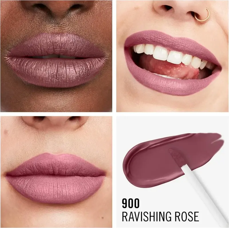 Discover the secret to perfect, long-lasting matte lips! Rimmel London Lasting Mega Matte Liquid Lipstick in 900 Ravishing Rose delivers an intense mega matte finish that stays put for up to 16 hours. This unique vegan formula is not only incredibly long-wearing but also hydrating, ensuring your lips feel comfortable and moisturized all day long, solving the problem of dry, uncomfortable matte lipsticks.