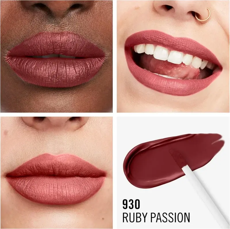 Experience the ultimate matte lip that feels incredibly comfortable! Rimmel London Lasting Mega Matte Liquid Lipstick in 930 Ruby Passion delivers a stunning, colour-drenched matte finish that lasts all day. This cruelty-free and vegan formula is super hydrating, infused with lip-loving ingredients like squalane and coconut oil, solving the problem of dry, uncomfortable matte lipsticks.