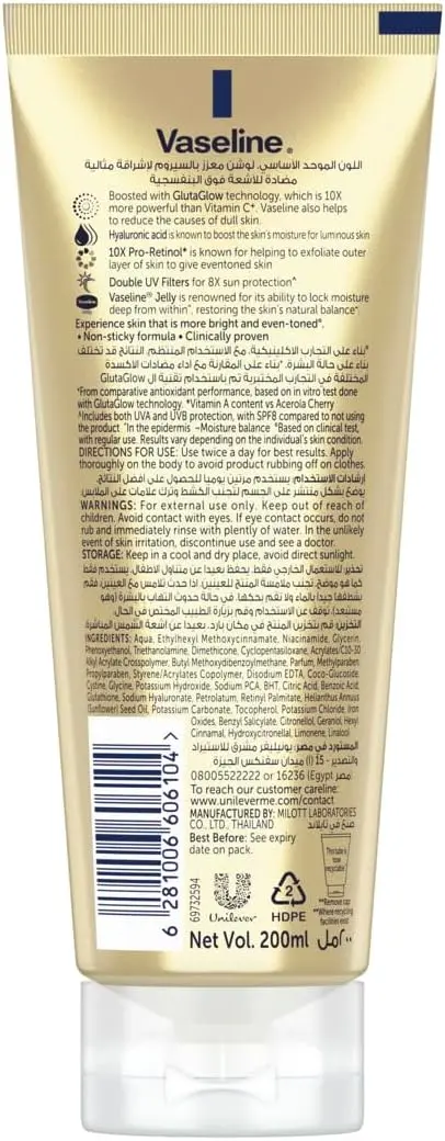 Is dullness and dryness dimming your skin’s natural radiance? Vaseline Essential Even Tone Flawless Glow Body Lotion is here to rescue you. This ultra-hydrating lotion transforms dull, dry skin with dark spots into smooth, even-toned, and soft skin. Powered by GlutaGlow technology, it’s 10X more potent than Vitamin C*, delivering a healthy, luminous glow and addressing uneven skin tone effectively.