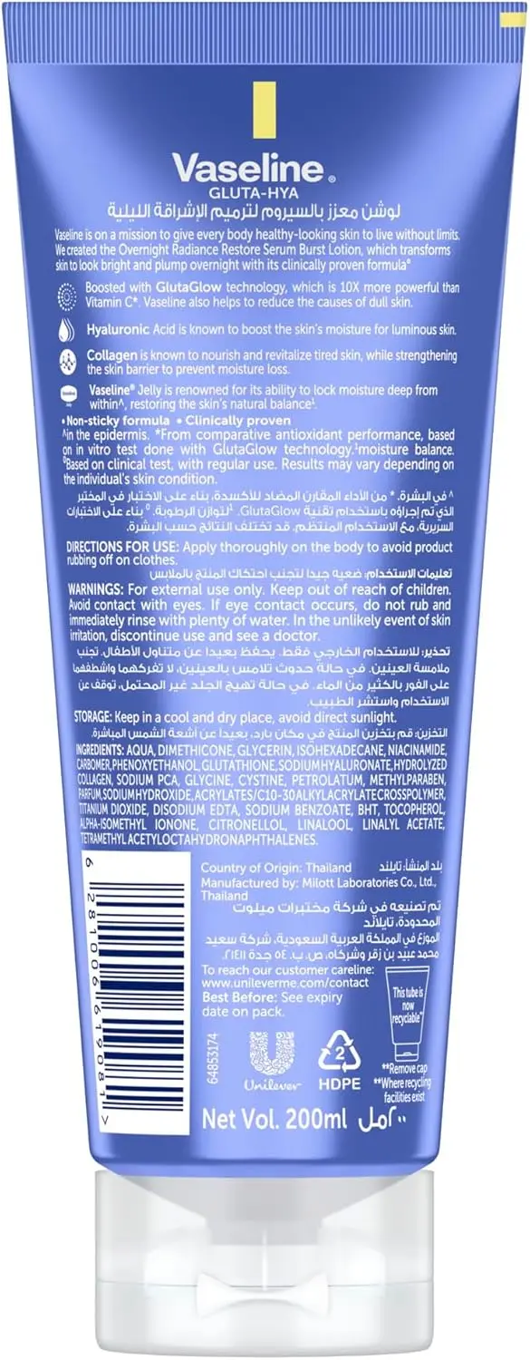 Wake up to revitalized skin with Vaseline Gluta-Hya Serum Burst Lotion, Overnight Radiance Restore. Tired of dull skin that lacks plumpness? This unique overnight lotion is designed to renew your skin, leaving it visibly plumper and smoother by morning. Its powerful formula works while you sleep, transforming your skin’s texture and appearance.