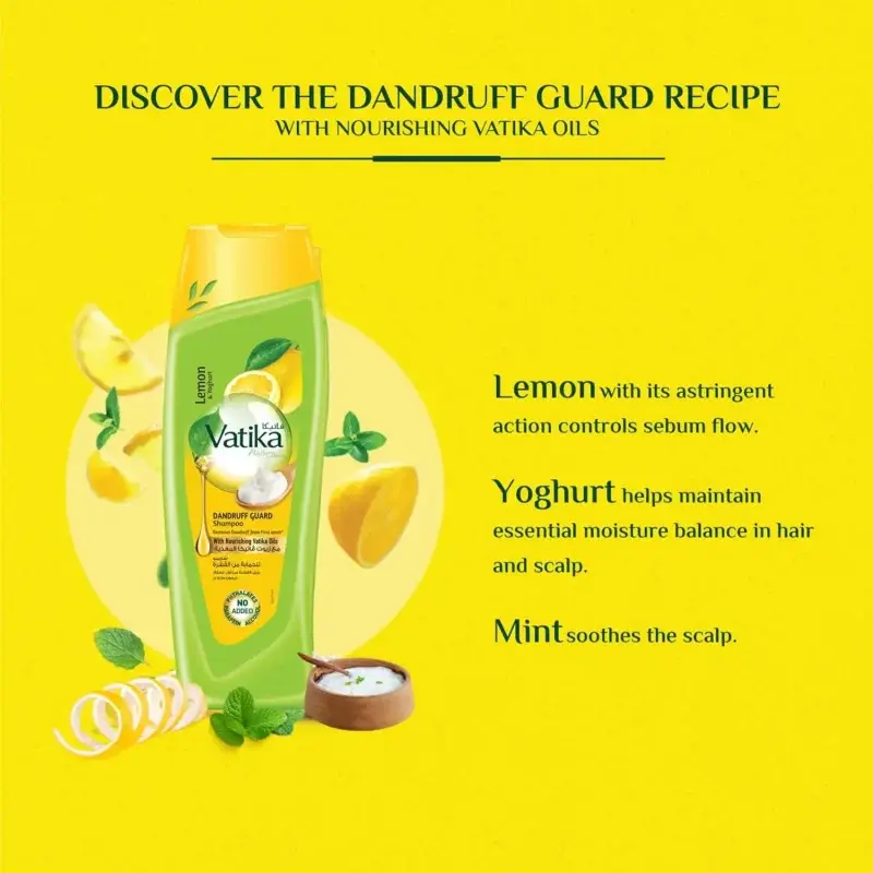 Is dandruff causing you discomfort and embarrassment? Vatika Naturals Dandruff Guard Shampoo is your natural defense against flakes and itchiness. Enriched with the goodness of Lemon and Yogurt, this shampoo not only tackles dandruff but also preserves the natural balance of your scalp, leaving your hair feeling clean and refreshed.