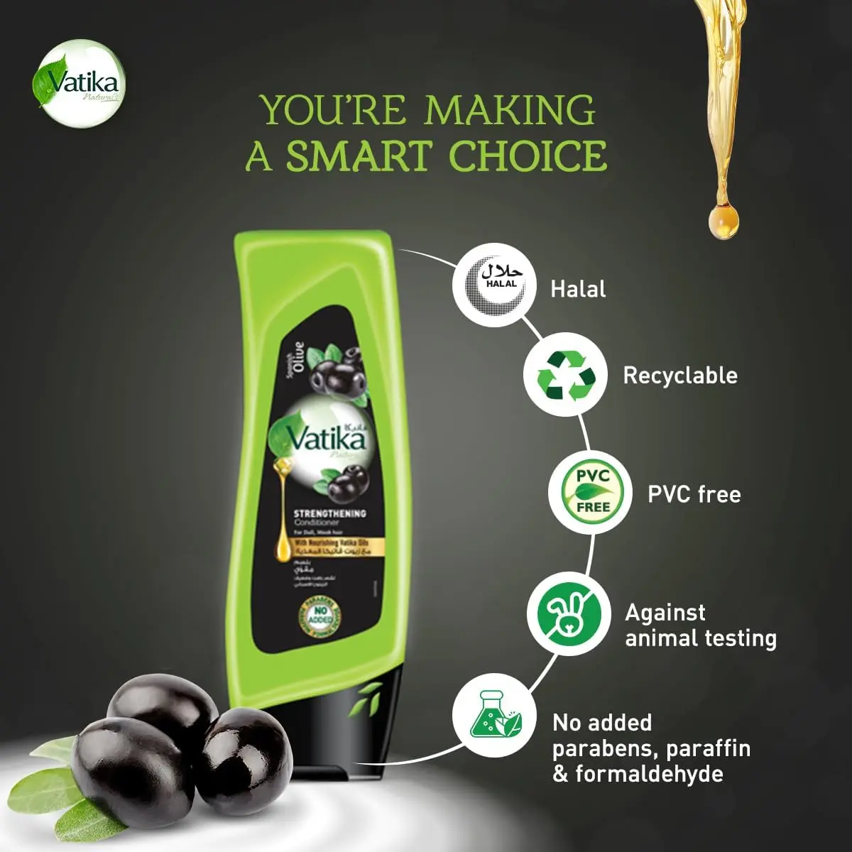 Are you struggling with dull, weak hair that’s prone to frizz? Vatika Naturals Spanish Olive Strengthening Conditioner is your answer to achieving strong, silky, and beautifully nourished hair. Carefully selected Spanish Black Olives are rich in essential nutrients and fatty acids that not only soothe your scalp but also protect your hair’s natural keratin.