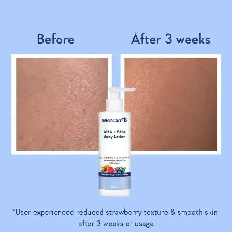 Are you tired of rough, bumpy skin that just won’t smooth out? WishCare’s 10% AHA + 1% BHA Body Lotion is here to transform your skin. This powerful yet gentle body lotion works to deeply exfoliate, revealing softer, smoother, and more radiant skin. Say goodbye to dullness and uneven texture, and hello to a body that feels incredibly soft and looks beautifully revitalized.